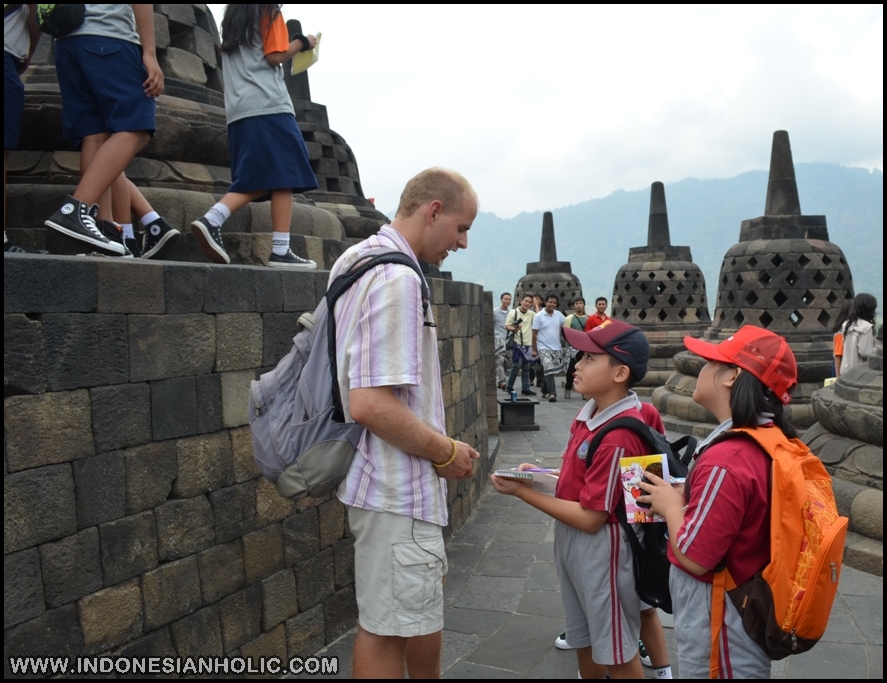 Candi Borobudur adalah sebuah mahakarya Indonesia yang kini telah menjadi warisan dunia. Candi Borobudur ditetapkan sebagai warisan dunia oleh UNESCO. Bukan hanya wisatawan domestik yang berdatangan tapi dari mancanegara juga banyak terlihat berseliweran di setiap sudut Candi Borobudur. Hari itu terlihat banyak anak sekolahan. Ada satu aktifitas yang membuat saya diam sejenak kemudian memperhatikannya. Anak-anak sekolahan yang datang ke Candi Borobudur ternyata punya tugas dari gurunya, dimana tugasnya mewawancarai bule’ dengan beberapa pertanyaan. Saya dibuat kagum dengan usaha adik-adik ini, masih kecil sudah bisa berbahasa inggris walaupun belum terlalu lancar tapi setidaknya mereka sudah dikenalkan dari kecil. Semoga saja ini bukan budaya kapitalis yang belajar budaya barat tapi meninggalkan atau tidak mengetahui budayanya sendiri