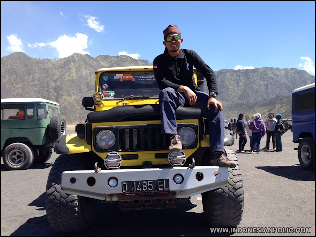 Mobil Jeep berbaris rapi dan kuda sedang sibuk mengantar pengunjung. Pandangan pertama yang terlihat di kawasan Kawah Bromo. Buat kami yang naik jeep tak bisa merapat lebih dekat dengan kawah, ada semacam tanda sebagai pembatas walaupun tidak dipagari tapi itu sudah dipatuhi dan dimengerti oleh sopir jeep. Tapi aturan tidak berlaku bagi pengendara motor, dengan mudahnya merapatkan motornya hingga di sekitaran pura. Jangan khawatir bagi yang ingin naik ke Kawah Bromo bisa melanjutkan dengan naik kuda.