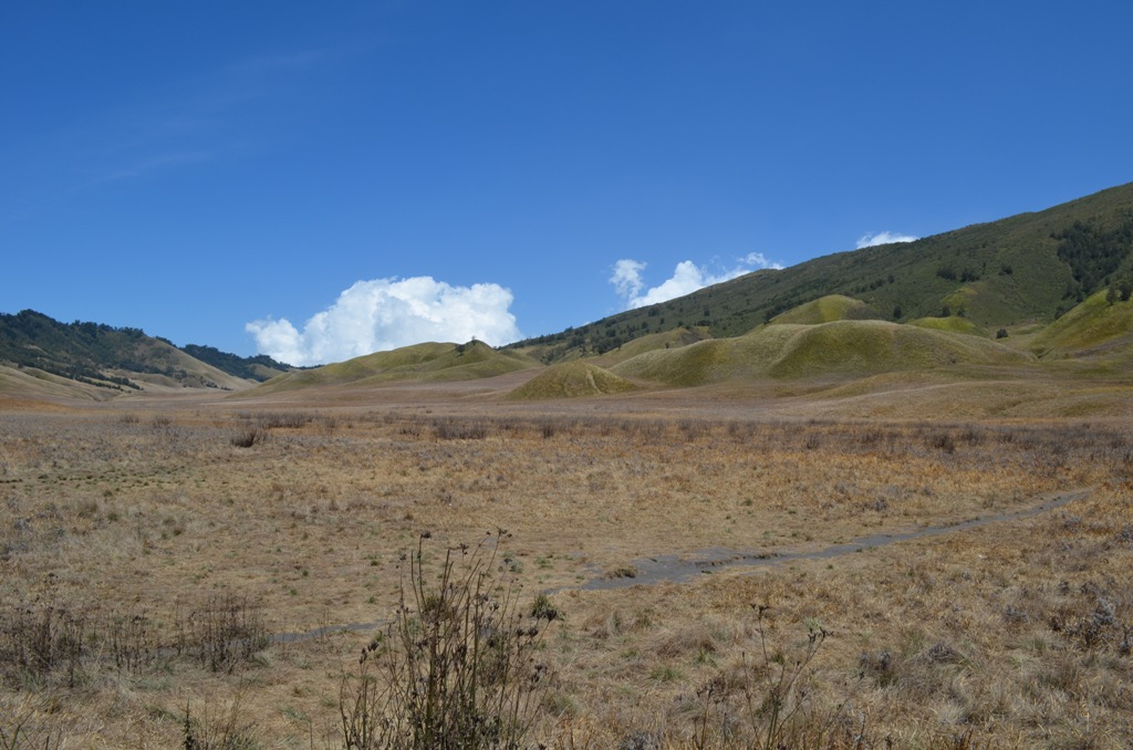 Tak terasa saya melihat sebuah beberapa gundukan tanah di lereng pegunungan. Jeep berhenti di tengah padang savana yang mengering. Ternyata gundukan tanah yang terlihat itu adalah Bukit teletubbies. Langit biru dan awan putih terpadu dengan bukit ditengah padang savana. Pemandangan yang sangat indah dan menakjubkan