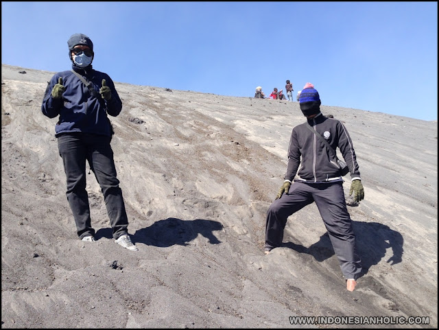 Kami memutuskan untuk turun dari kawah. Ternyata turun tak sesulit ketika naik, yang dibutuhkan hanya kekuatan kaki untuk mengerem agar tidak terpleset. Saya turun dengan berlari dan saya sangat menikmati tapi jangan dicontoh karena ini sedikit berbahaya. Tak lama berselang kami sudah berada di jalur yang landai. Ada beberapa penjual makanan dan minuman juga ternyata. Mereka seakan menjadi pelipur lara bagi orang-orang yang sudah turun dari puncak.