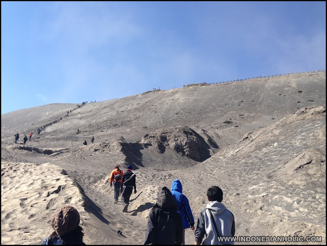 Langkah demi langkah ahirnya kami tiba daerah penanjakan yang mengharuskan mengumpulkan energi untuk berjalan menanjak. Sebelumnya perjalanan hanya berjalan lurus dan rata, kali ini medan 45 derajat dan berpasir sudah di depan kami. Hal yang membuat saya sedikit mengeluh bukan karena berjalan di bawah panas terik matahari tapi bau kotoran kuda yang bercampur dengan pasir membuat saya sulit bernafas. Berjalan sambil menutup hidung untuk menghindari pasir dan bau kotoran kuda tapi dilain sisi saya sulit bernafas, sungguh pilihan yang sulit.