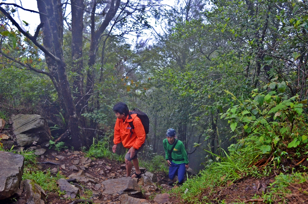 Pos 1 sampai dengan pos 3 sudah menguras tenaga saya dan tim yang lain, tapi setelah itu saya sudah bisa bernafas lega. Jalur selanjutnya sudah terlihat landai melintasi rimbunan pohon yang menjulang tinggi ke atas. Jarak antara pos ke pos tidak terlalu jauh jaraknya, membuat saya semakin semangat jika melewati setiap pos. Saya bersama Kak Sapot, Kak Fhandy dan Sujarman berada di kelompok paling belakang dan kami sempat tertahan di pos 4 sekitar setengah jam berteduh dari hujan.