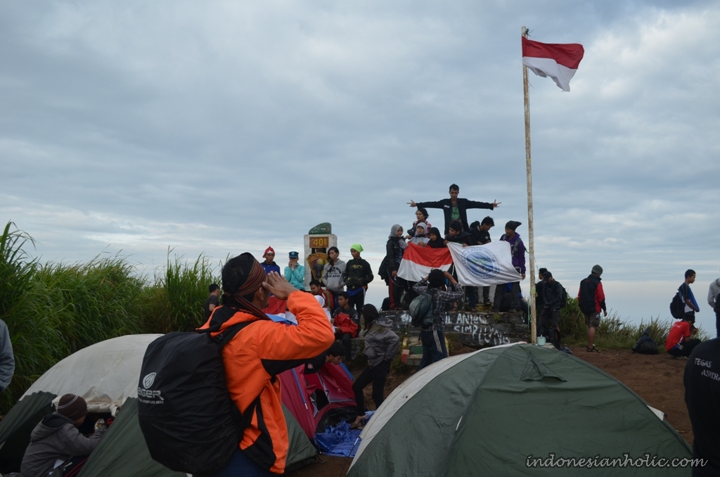 Akhirnya kami tiba di puncak Gunung Ungaran yang mana memiliki ketinggian 2050 mdpl. Beberapa pendaki sudah memenuhi puncak. Puncaknya sendiri memiliki tanah yang landai dan terdapat tugu yang di bangun oleh militer setempat dan terdapat pula sebuah tiang berdiri kokoh mengenggam bendera merah putih.