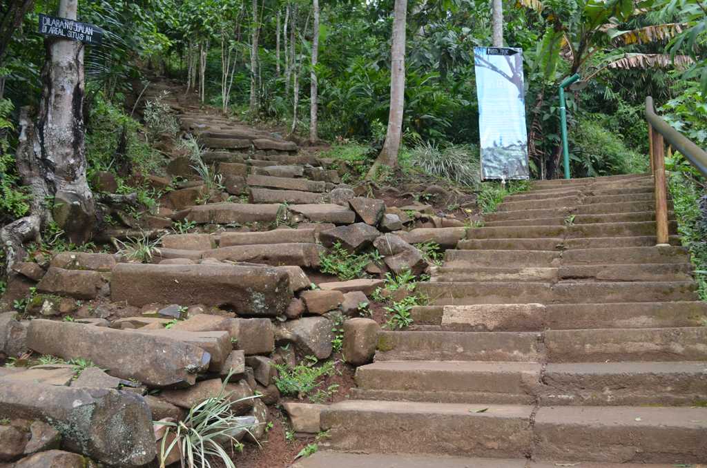 Setelah proses administrasi selesai saatnya kita melakukan pendakian, jangan khawatir pendakiaanya tidak sulit kok karena untuk mencapai puncak anda akan melewati anak tangga yang sudah dibangun. Pilihan jalurnya ada dua yaitu jalur ziarah dan jalur wisata, dimana jalur wisata lebih mudah dibanding jalur ziarah namun anda harus berjalan lebih jauh. Saya memutuskan untuk naiknya lewat jalur wisata berhubung saya dalam kondisi berpuasa pada saat itu. Perlahan saya sudah menaiki beberapa anak tangga tapi masih belum melihat puncak, untuk jumlah anak tangga saya tidak tahu untuk lebih jelasnya silahkan berkunjung dan hitung sendiri. Nafas mulai ngos-ngosan dan kaki mulai terasa berat untuk dilangkahkan tapi seketika saya melihat kumpulan bebatuan dan saya percaya bahwa itulah puncak situsnya, semuanya terasa mudah dan bersemangat untuk berjalan.